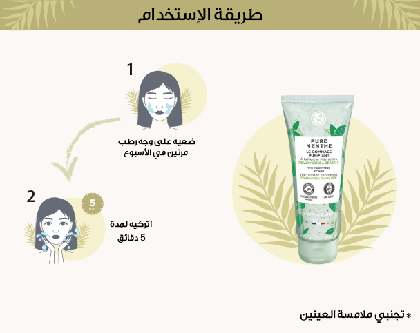 طريقة الاستخدام: ضعيه على وجه رطب مرتين في الأسبوع ودلكيه بلطف واشطفيه. تجنبي ملامسة للعينين ولا تضعيه على البشرة المتضررة أو المتهيجه